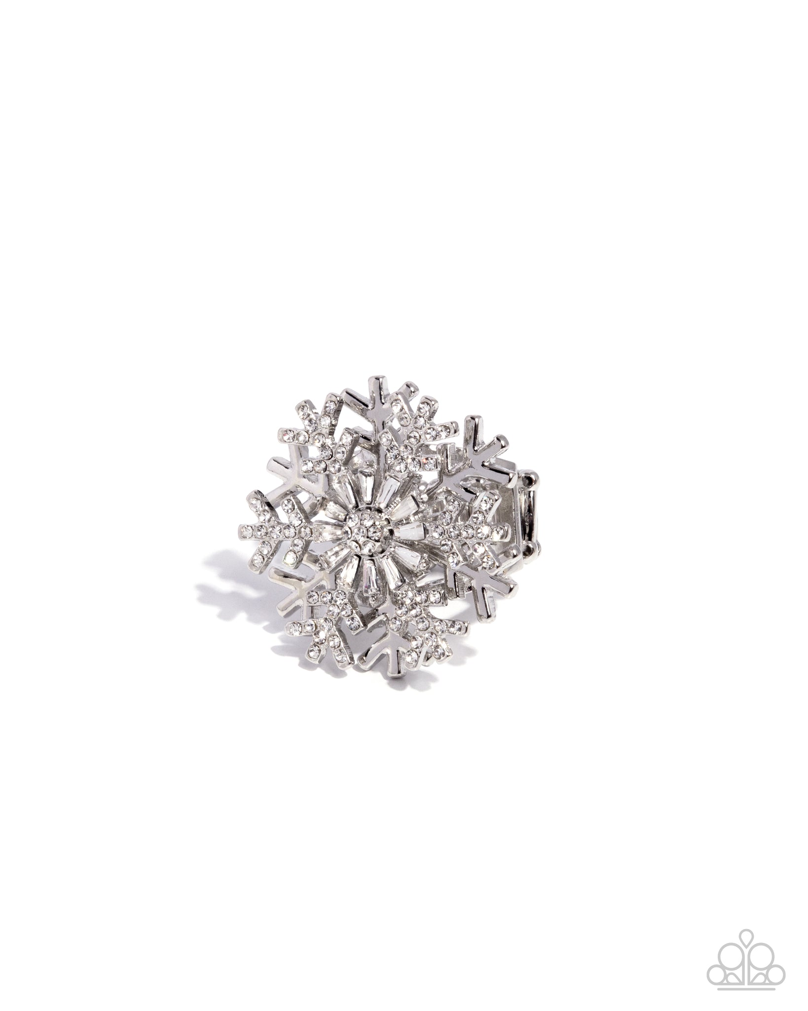 Sporadically dusted with dainty white rhinestones, dainty silver snowflake-inspired bars stem from an emerald-cut white gem and rhinestone center into an intricate, Christmas-inspired design that sits atop the finger. The dizzying framework allows the skin to show through, infusing the design with airy whimsicality. Features a stretchy band for a flexible fit.
