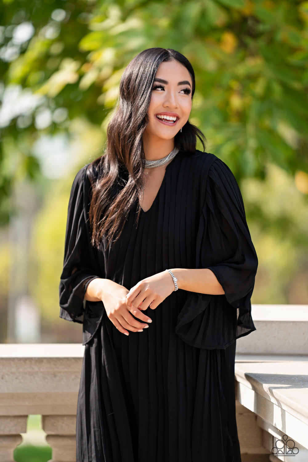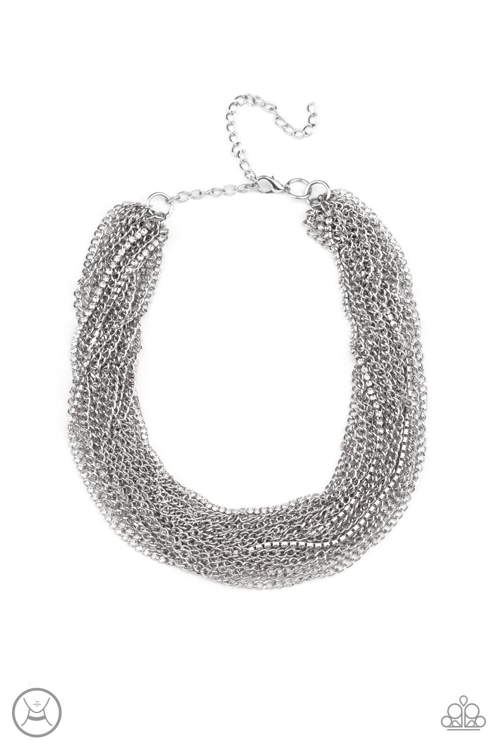 Hints of white rhinestones peek out between layer after layer of glistening silver chains, creating a dramatic display around the neck. Features an adjustable clasp closure.
