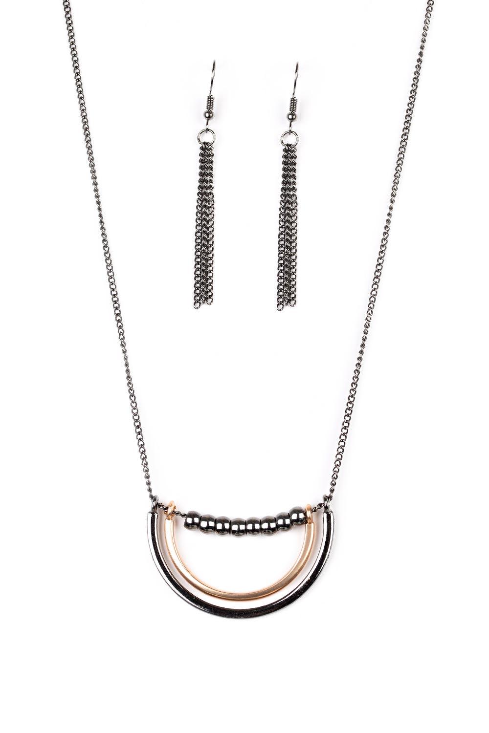 A strand of shiny gunmetal beads give way to bowing gold and gunmetal frames, creating an edgy pendant below the collar. Features an adjustable clasp closure.