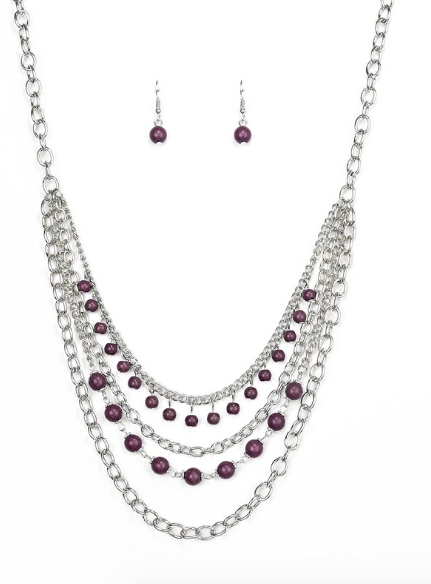 Featuring vivacious purple stone accents, mismatched silver chains layer below the collar for a seasonal look. Features an adjustable clasp closure. Sold as one individual necklace. Includes one pair of matching earrings.