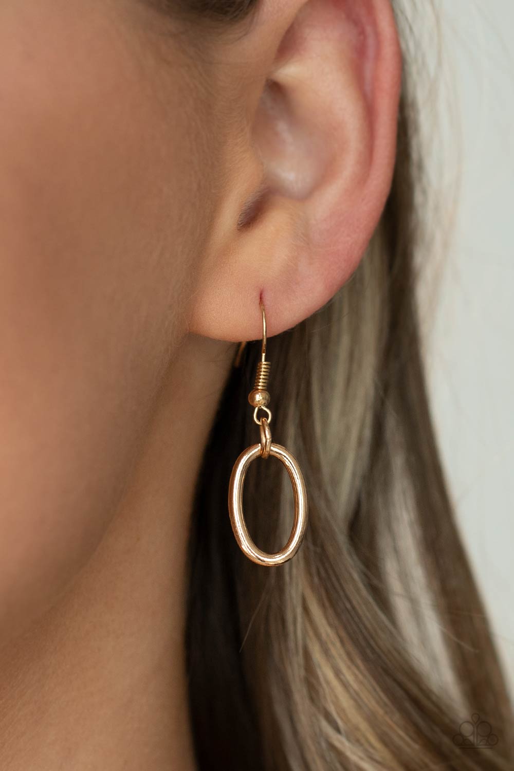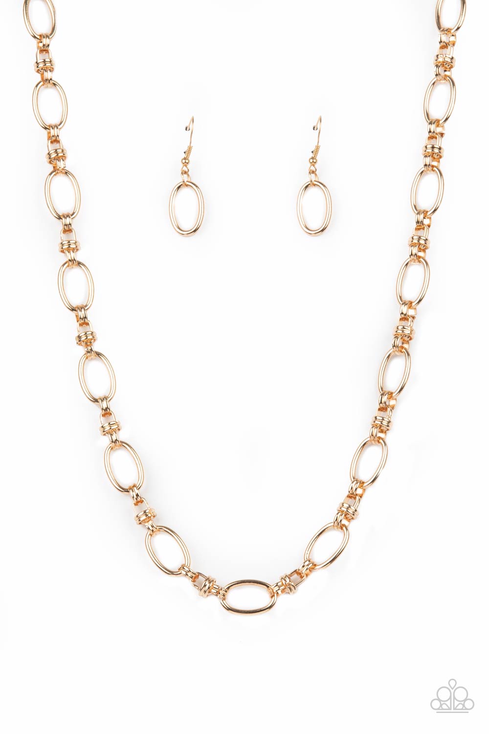 Pairs of joined gold links connect a collection of gold oval frames below the collar, creating an edgy chain. Features an adjustable clasp closure.