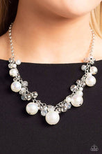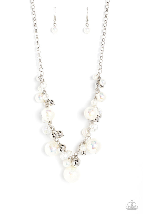 Featuring glassy and polished finishes, pristine white and silver beads cascade from the bottom of a classic silver chain, creating a gorgeous clustered fringe below the collar. Varying sizes of iridescent beads, featuring a subtle scratch surface, add a refined shimmer to the clustered display for a gorgeous effect. Features an adjustable clasp closure. Due to its prismatic palette, color may vary.