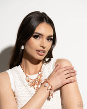 An eclectic display of shimmery shiny copper texture and beach-inspired accents gathers along thick, shiny copper links, creating a boisterous display along the wrist. The hodgepodge of texture and sheen includes textured shiny copper starfish, baroque white pearls, white seashells, dainty white pearls, and a dainty white pearl-encrusted shiny copper starfish. Features an adjustable clasp closure.