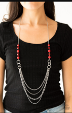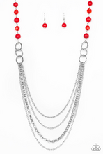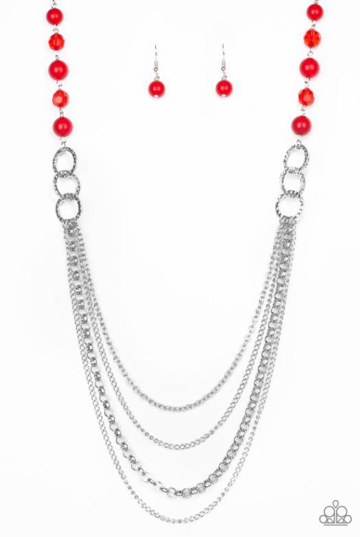 Polished red, faceted crystal-like and delicately hammered silver hoops give way to mismatched silver chains down the chest for a whimsical look. Features an adjustable clasp closure.